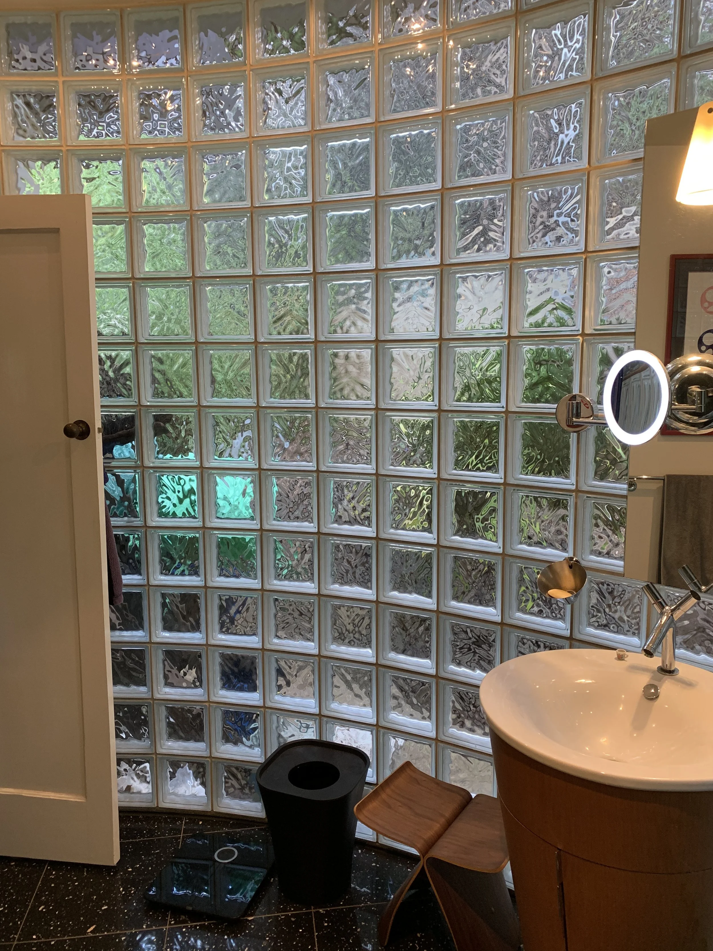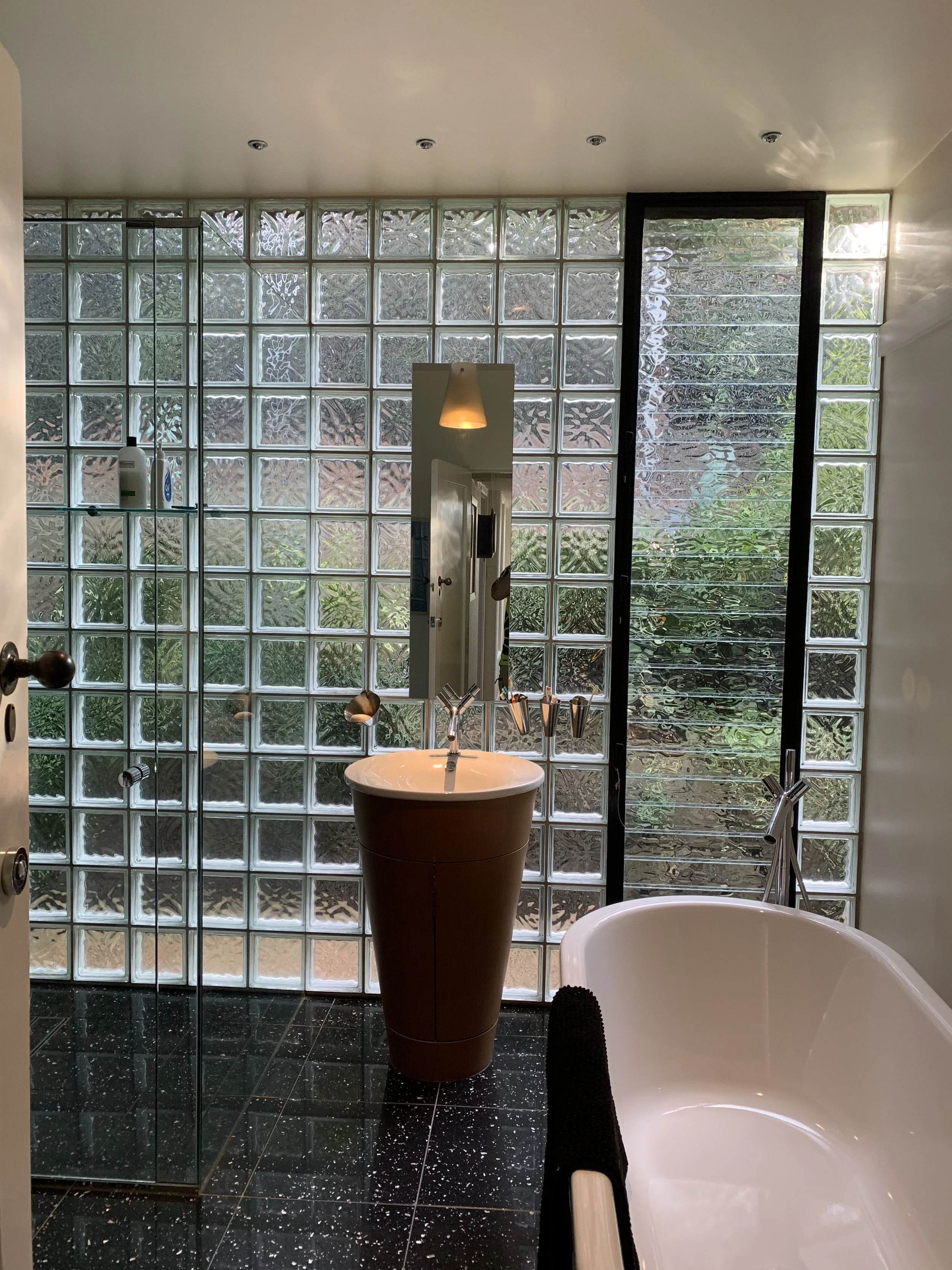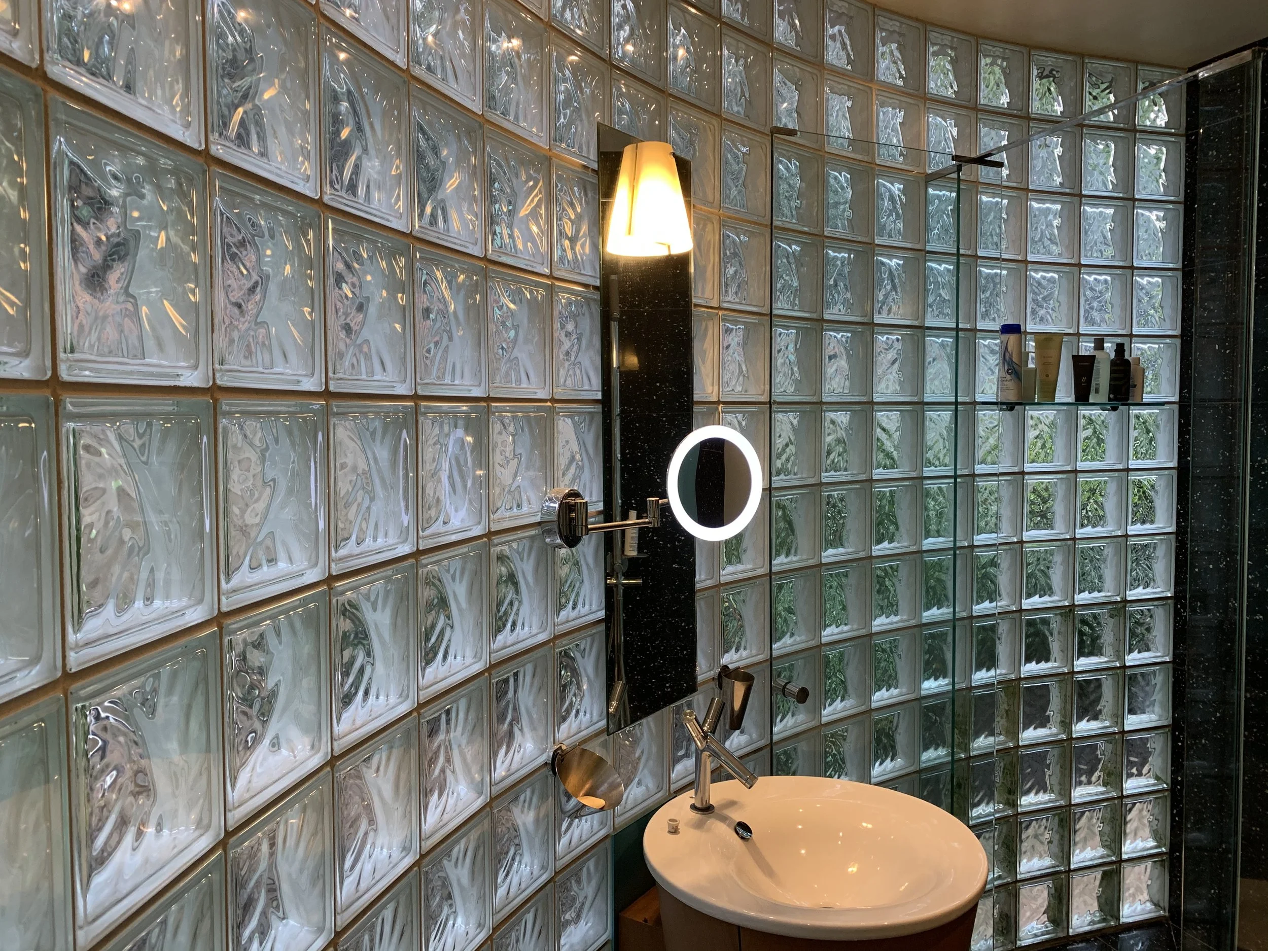 An exciting example of keeping Nature up close and personal. This property has an extensive garden that surrounds you and lifts your spirit. This circular ensuite and separate bathroom allow you to embrace this paradise whilst keeping your privacy. Glass Brick: Solaris Wolke 190x190x80